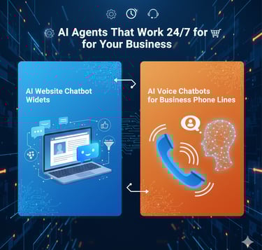 AI Agents are intelligent virtual assistants that engage customers instantly on your website or over the phone. Website chatbots answer questions, capture leads, and guide visitors 24/7, while AI voice agents handle business calls, schedule appointments, & provide seamless customer support, all while delivering a consistent, professional customer experience.