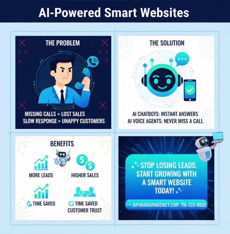 At AI Paradigm Marketing, we build Smart Websites powered by advanced AI Chatbots and Voice Agents — designed to answer questions instantly, qualify leads, book appointments, and drive consistent growth around the clock.